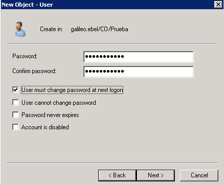 Una vez tengamos estos campos completos, damos clic en Siguiente o Next (depende el idioma de nuestro Server) e ingresaremos la contraseña a otorgar al usuario: