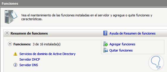 A través de la opción Funciones podemos ver que funcionalidades tiene activas el servidor (DNS, DHCP, etc) y en caso de que requiramos agregar más o eliminar lo podremos hacer siguiendo los siguientes pasos: