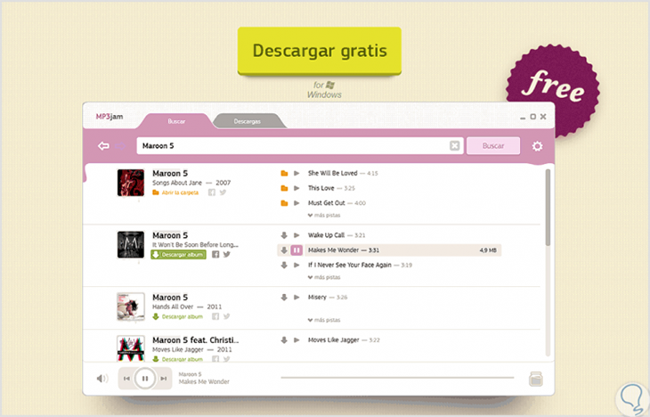 Esta es otra web que nos permite descargar música de manera sencilla y rápida. En la página principal vas a poder encontrar el Top 100 de artistas así como el Top de álbumes. Dispones de un buscador en la parte superior en el cual puedes escribir el titulo que estas buscando para una mayor rapidez en tu búsqueda. Es una web que contiene cantidad de canciones y artistas. Para su descarga tienes que seleccionar aquella canción que te interesa y en la barra del reproductor vas a encontrar una flecha invertida la cual indica su descarga. Debes pulsar sobre ella y listo.