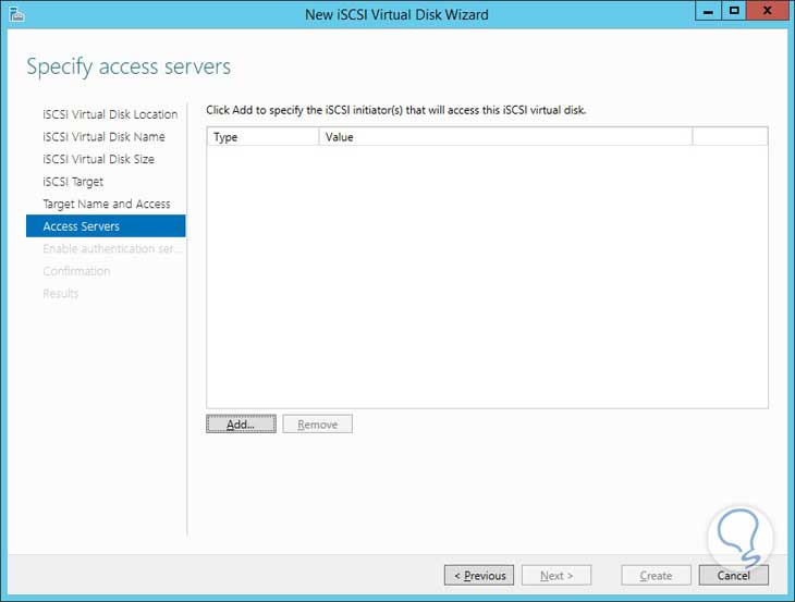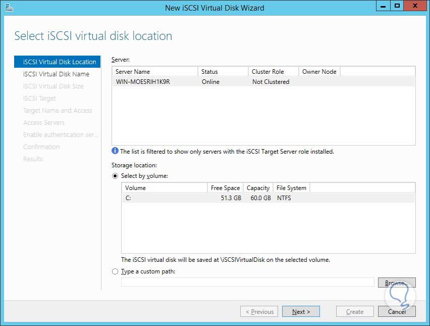 Una vez se despliegue esta opción elegimos iSCSI y allí damos clic en la opción To create an iSCSI virtual disk en el panel derecho: