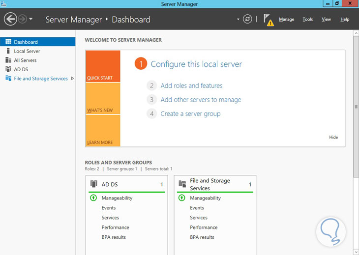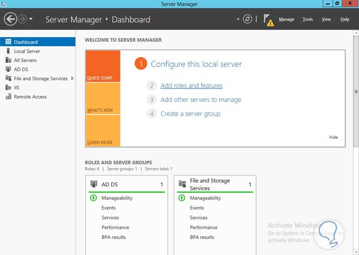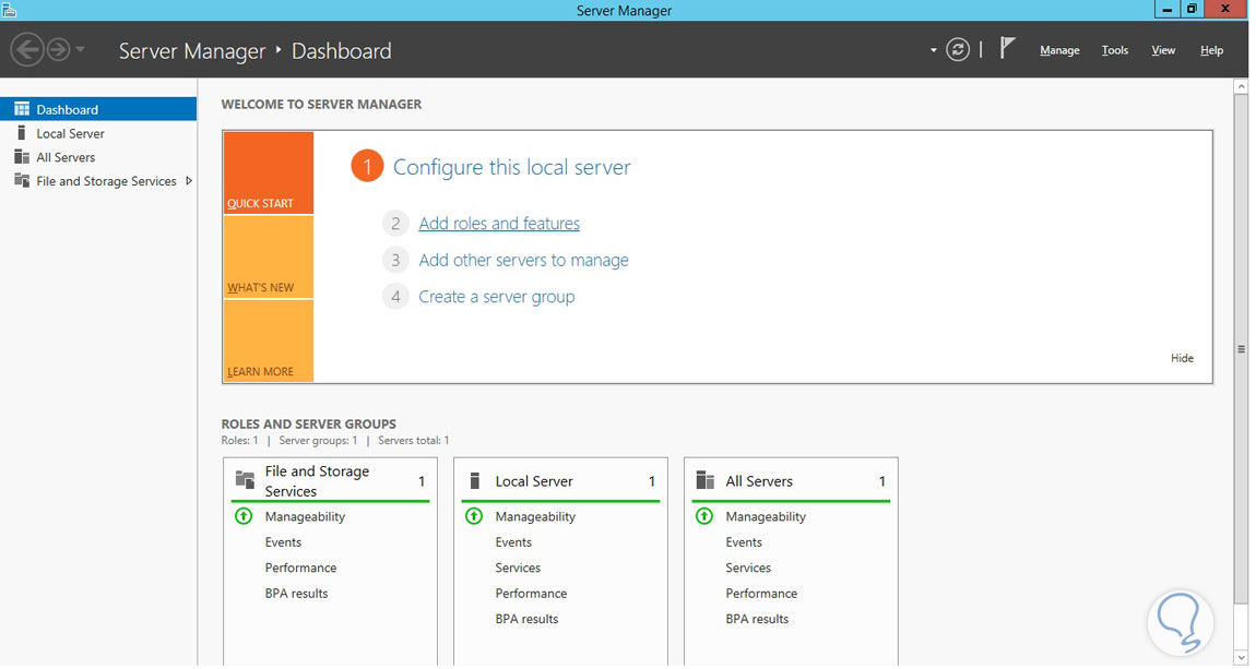 Abrimos la ventana de Server Manager o Administre su servidor (Por defecto se despliega una vez iniciada sesión), elegimos la opción Add Roles and Features: