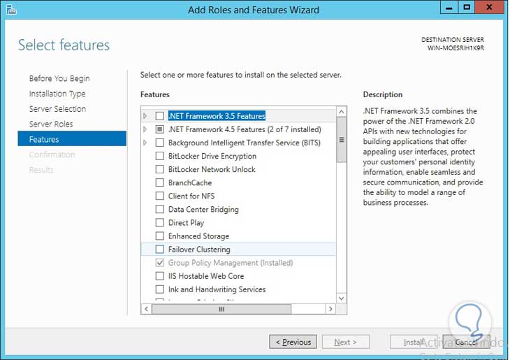 Incluimos características y comenzamos la instalación.