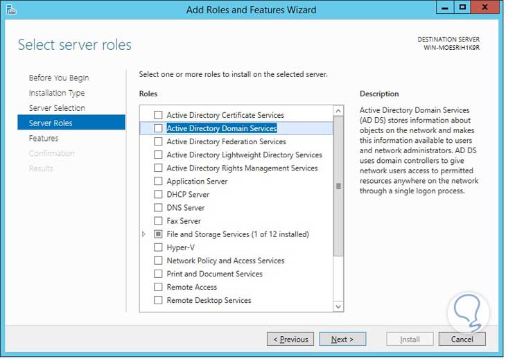 Posteriormente seleccionamos la opción Active Directory Domain Services o Servicios de Directorio de Active Directory