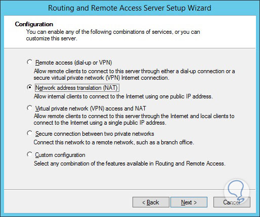 Vemos que se despliega el asistente, damos clic en Next, elegimos la opción NAT: