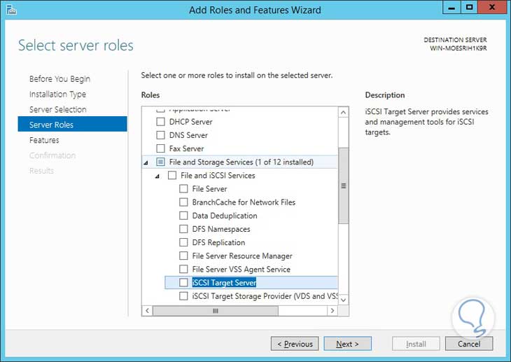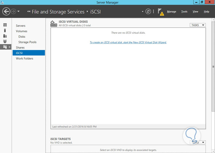 Allí desplegamos la opción File and Storage Services (Servicios de Archivo y Almacenamiento), luego elegimos Files and iSCSI Services y allí seleccionamos iSCSI Target Server: