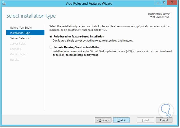 En la ventana de inicio damos clic en Next o Siguiente, elegimos la opción Role-based or Feature-based Installation, luego clic en Next