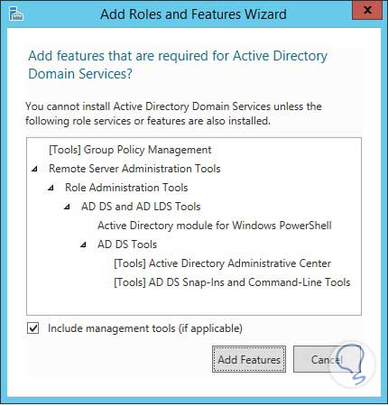 Una vez selecciono este servicio, se despliega la siguiente ventana donde se nos pregunta si deseamos adicionar las características de Active Directory Domain Services, decidimos sí o no: