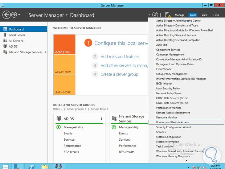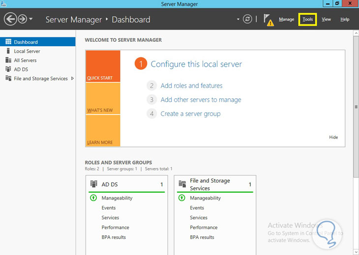 - Debemos configurar el acceso remoto en nuestro Controlador de Dominio, para ello vamos al servidor que es DC (Domain Controller), abrimos nuestro Server Manager y desplegamos la opción Tools (Herramientas) ubicada en la parte posterior derecha: