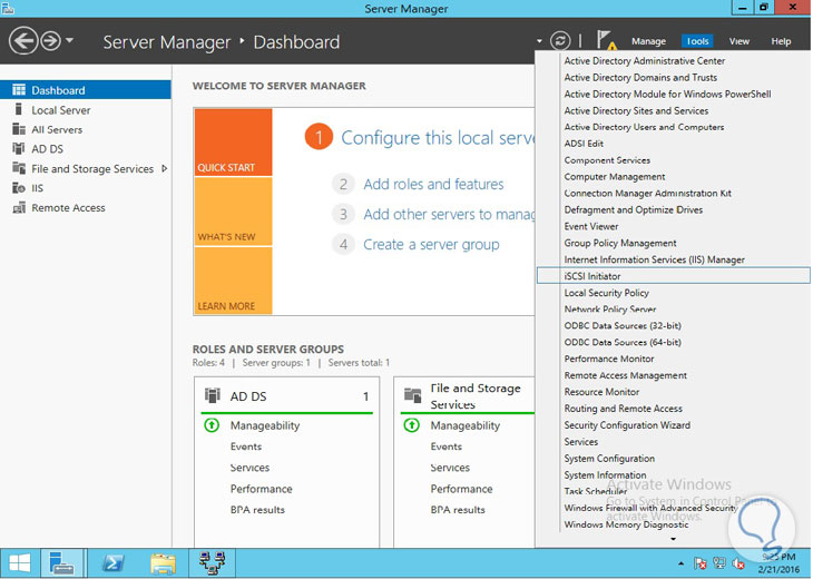 Posteriormente debemos agregar el disco iSCSI a los nodos o servidores de nuestro clúster, para ello vamos a los servidores (en nuestro ejemplo Nodo 1 y Nodo 2) y en la ventana de Server Manager elegimos del menú Tools / Herramientas, la opción iSCSI initiator / Iniciador de iSCSI:
