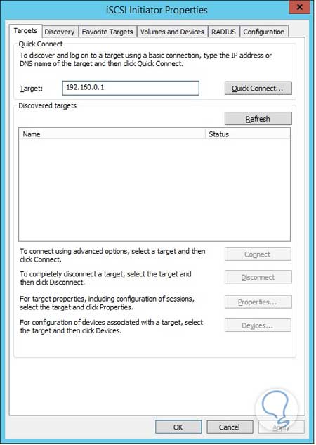 Damos clic en Quick Connect, se despliega la dirección donde está ubicado nuestro disco iSCSI y damos clic en OK.