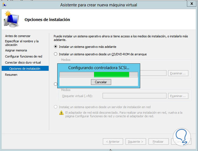 Las demás ventanas que se despliegan son similares a las de la primera generación: Configuración de red, nombre, tamaño y ubicación del disco virtual, instalación del sistema operativo y finalmente se mostrará un resumen de la máquina que vamos a montar: