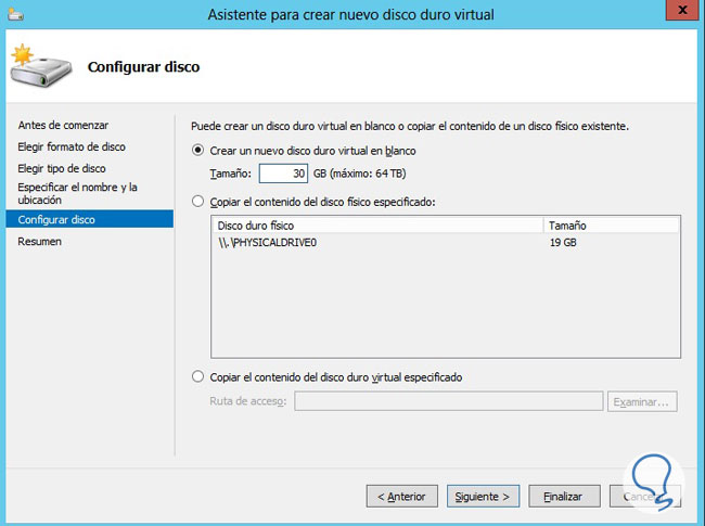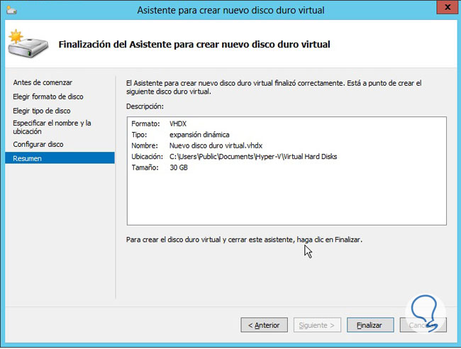 Después de dar clic en Siguiente, veremos un resumen del disco duro creado y para proceder a crearlo damos clic en Finalizar.