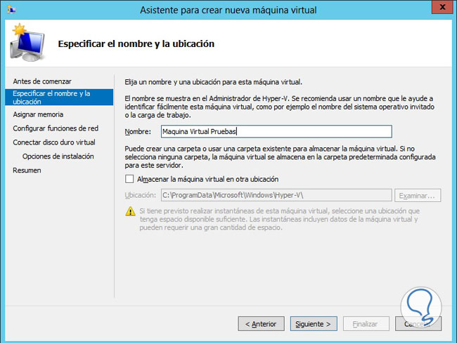 En la siguiente ventana elegimos un nombre para la máquina virtual y podemos especificar la ubicación donde se instalará: