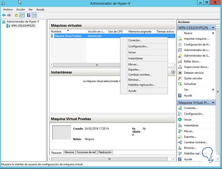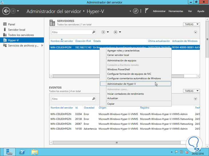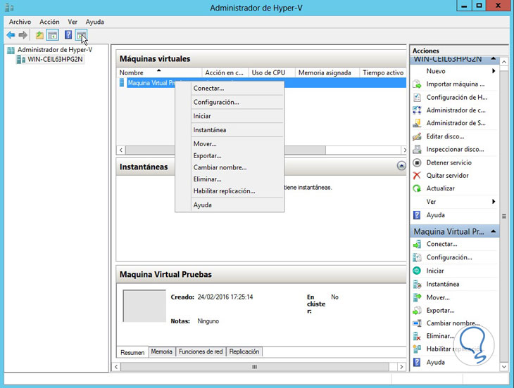 - Dando clic derecho sobre el servidor en el panel de Hyper-V.