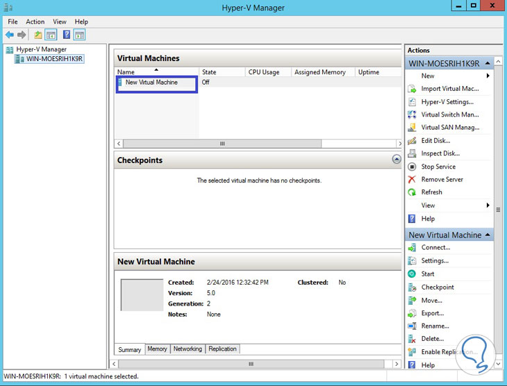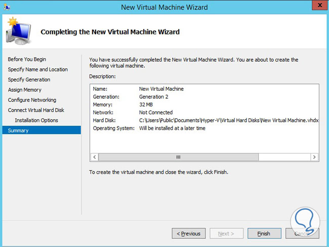 Para comenzar la instalación damos clic en Finish- Finalizar. Ya podremos ver la máquina creada en el menú de Hyper-V: