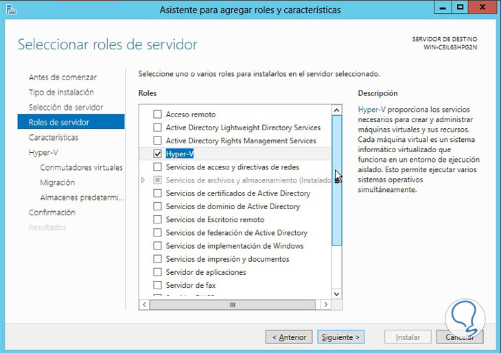 En la siguiente ventana elegiremos el rol Hyper-V, damos clic en Siguiente.