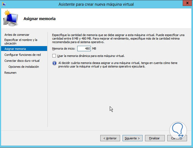 Damos clic en Siguiente, a continuación determinamos la cantidad de memoria que utilizaremos para dicha máquina (el rango está entre 8 MB y 480 MB).