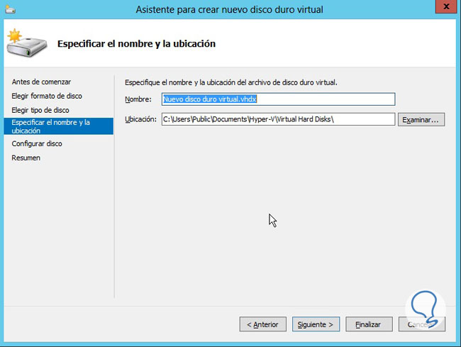 Seleccionamos el tipo de disco que sea requerido y damos clic en Siguiente, especificamos el nombre del disco y la ubicación: