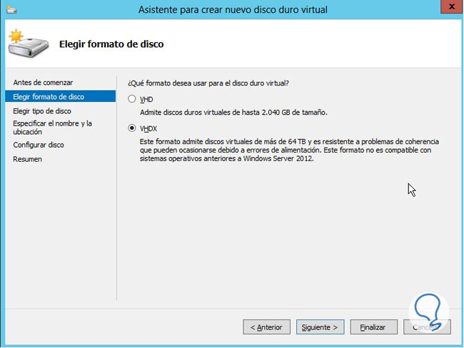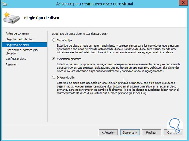Damos clic en Siguiente y se desplegará la ventana donde elegimos que tipo de disco deseamos crear, tenemos 2 opciones: