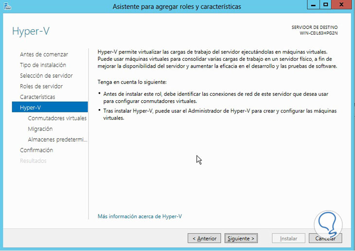 En la ventana que se despliega veremos un resumen de la función de Hyper-V.