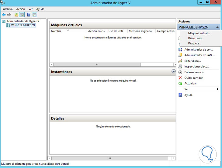 Una vez abierto el administrador, del menú Acciones elegimos la opción Nuevo y seleccionamos la opción Máquina virtual.