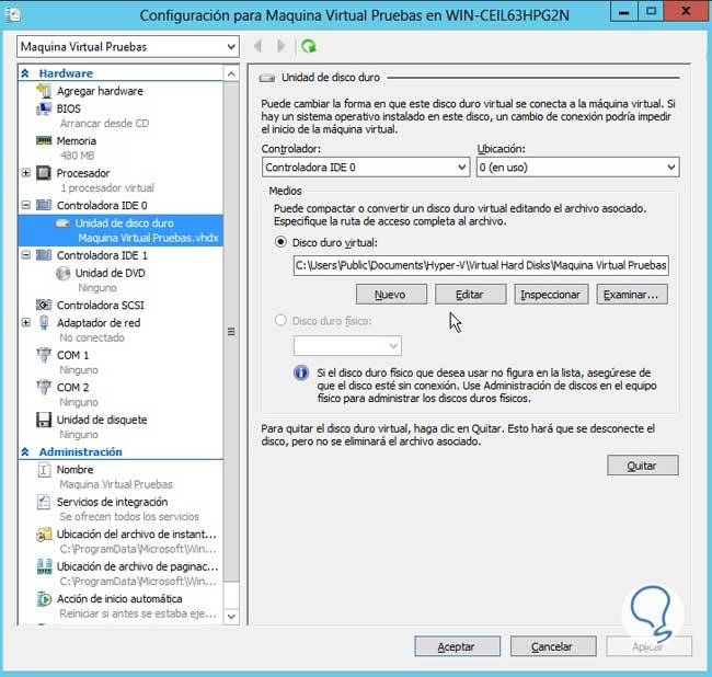- Editar Disco: Permite gestionar los discos duros virtuales disponibles.
