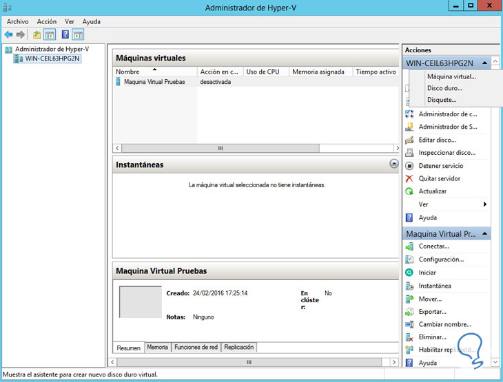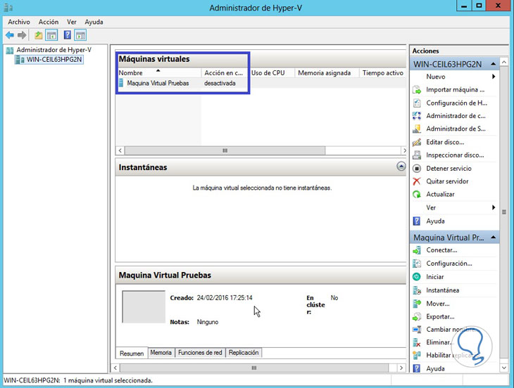 Veremos en nuestro panel de Hyper-V la máquina que acabamos de crear: