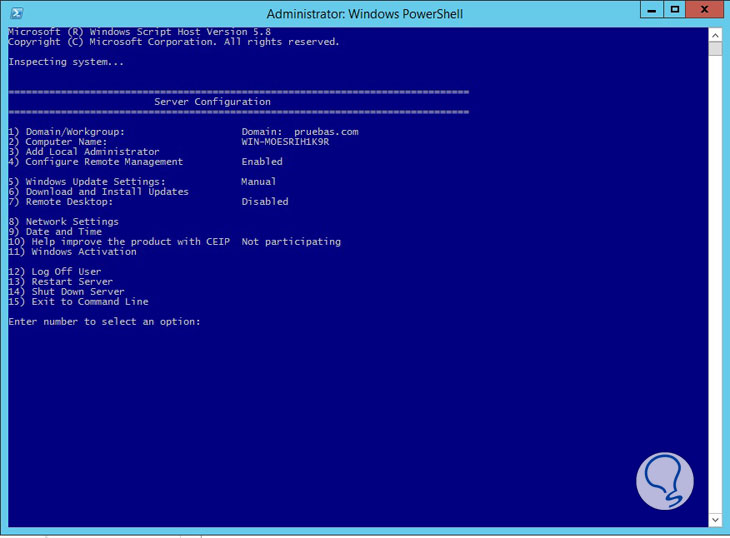 Podemos ejecutar estas tareas mediante el comando sconfig en Powershell: