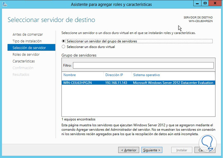 En la siguiente ventana elegiremos el servidor en el cual vamos a instalar el rol de Hyper-V, damos clic en Siguiente.