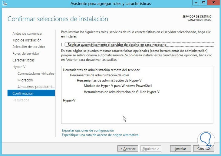 Install-WindowsFeature –Name Hyper-V -ComputerName <name> -IncludeManagementTools –RestartCon ello lo tendremos instalado.