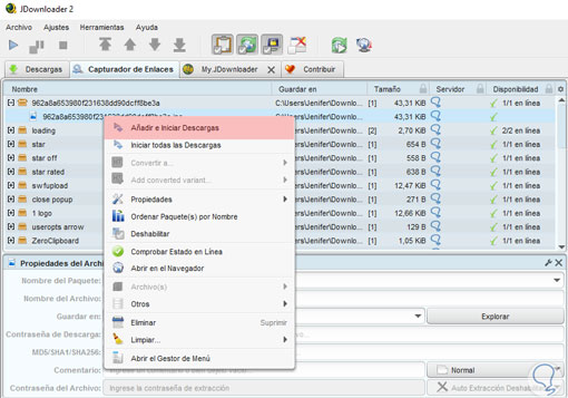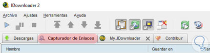 Tras instalarlo, abre el programa JDownloader y dirígete, desde el menú principal de pestañas a la ventana de “Capturador de enlaces” para empezar a descargar imágenes de tu site.