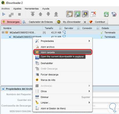 Tras añadir los enlaces a descargas vamos a la pestaña de “Descargas” y veremos los archivos descargados. Para ir directamente a la ubicación del archivo haz clic en botón derecho, “abrir carpeta”.