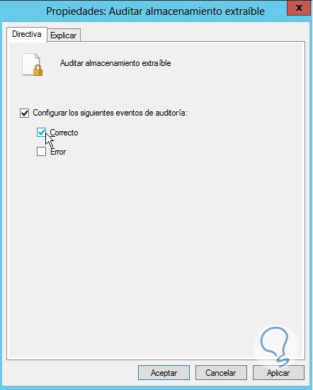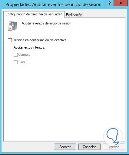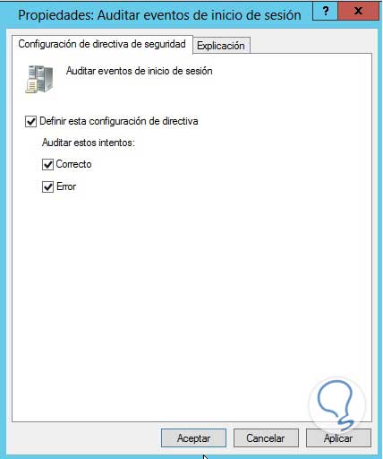 Marcamos el check box Definir esta configuración de directiva para habilitar dicha política, y activamos ambas casillas (Correcto y Error) y damos clic en Aplicar y finalmente en Aceptar para guardar los cambios.