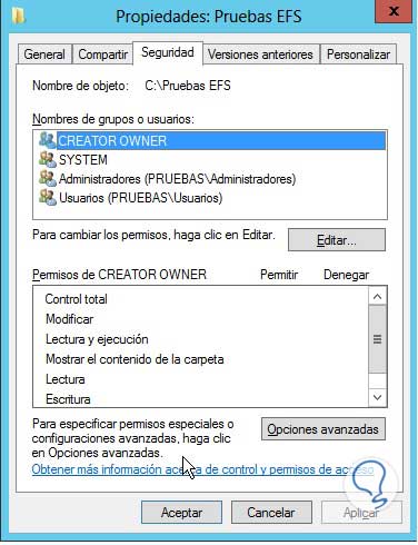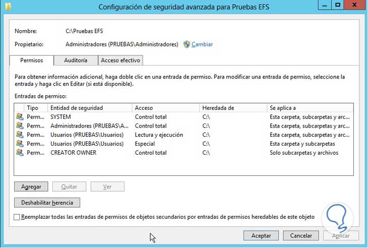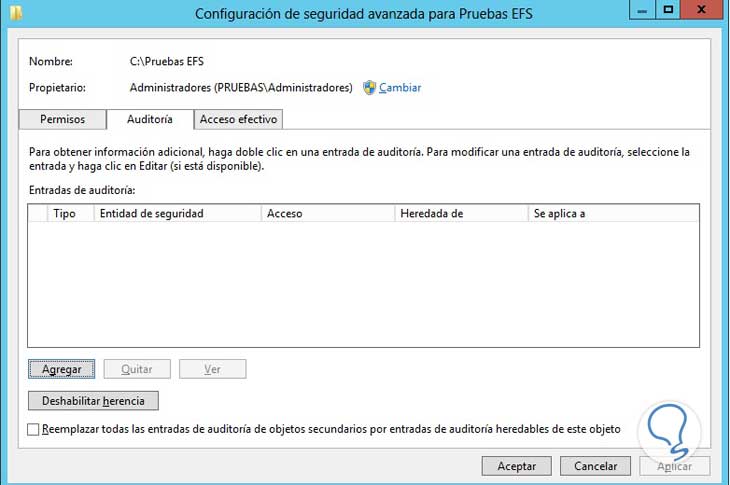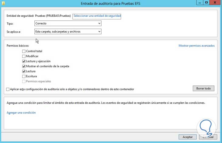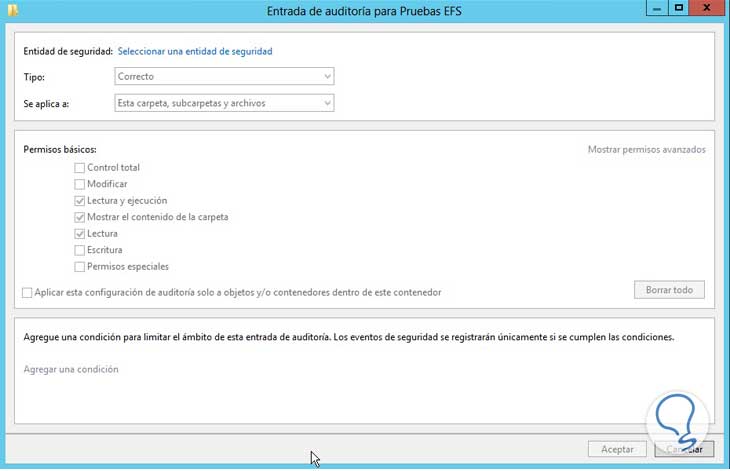 Finalmente especificamos los parámetros de la auditoría (Lectura, Escritura, etc), damos clic en Aceptar para guardar los cambios.