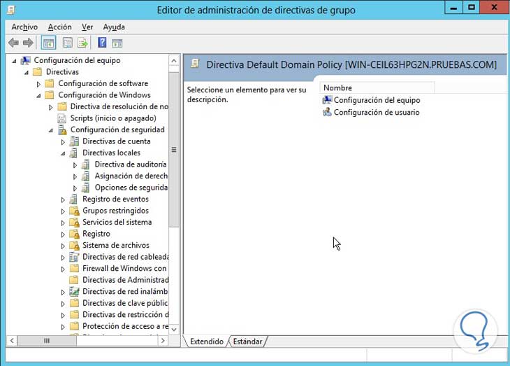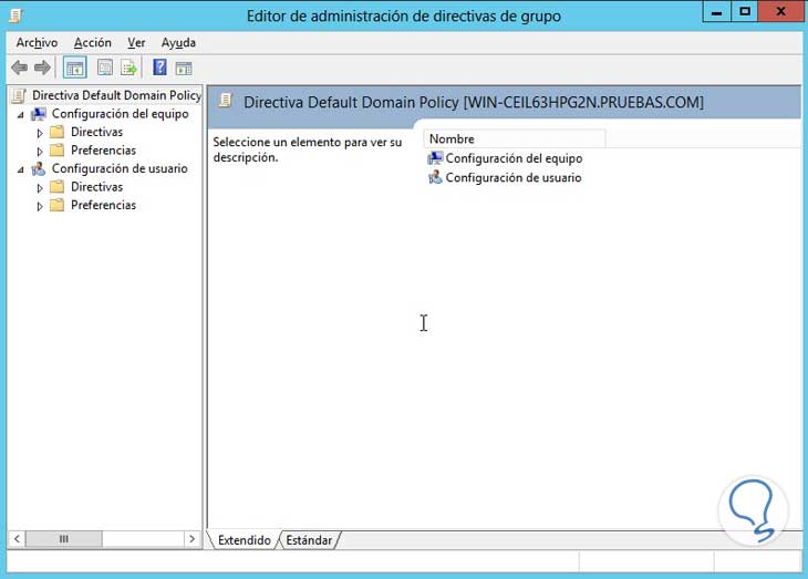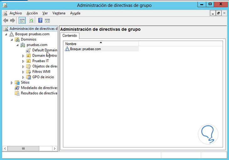 AsÍ desplegará el menú de las GPOs, debemos desplegar el dominio actual y damos clic derecho en Default domain policy.