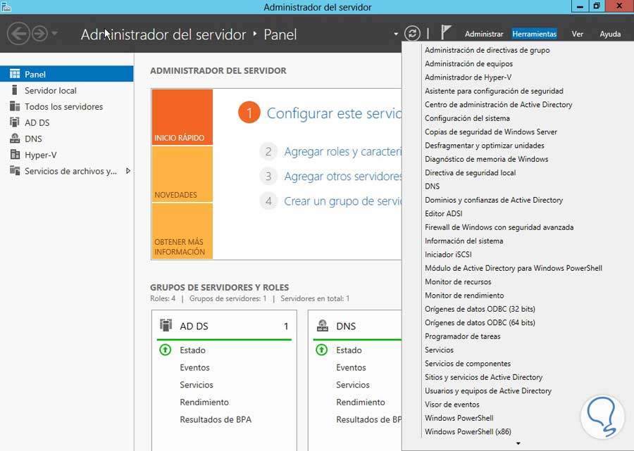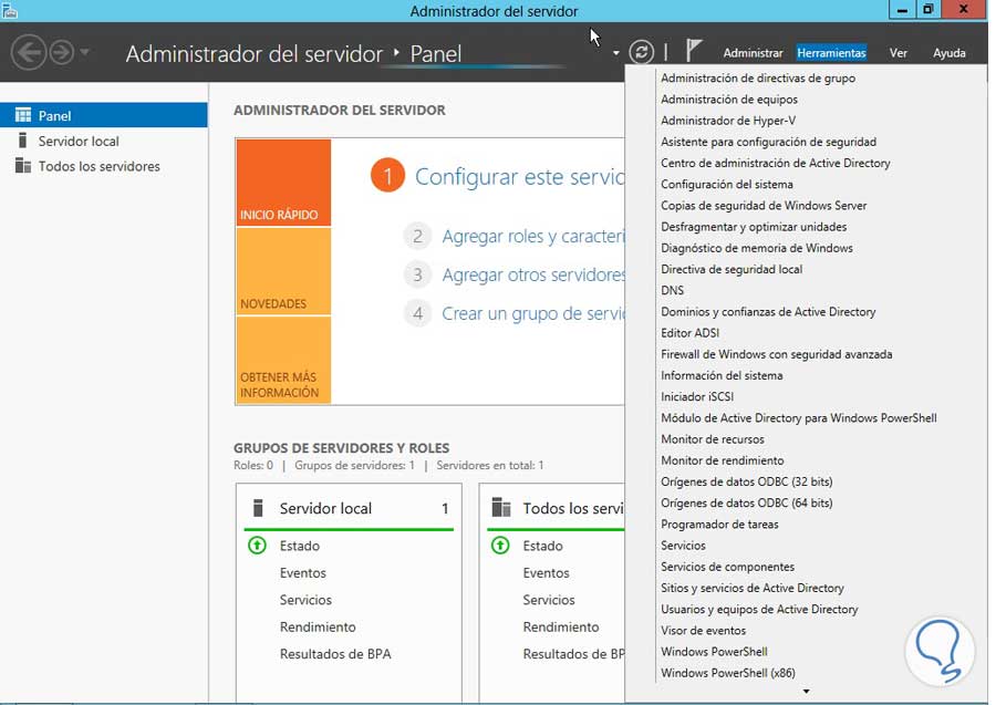 Abrimos nuestro Administrador del Servidor o Server Manager. Damos clic en Herramientas y elegimos la opción Administración de directivas de grupo.