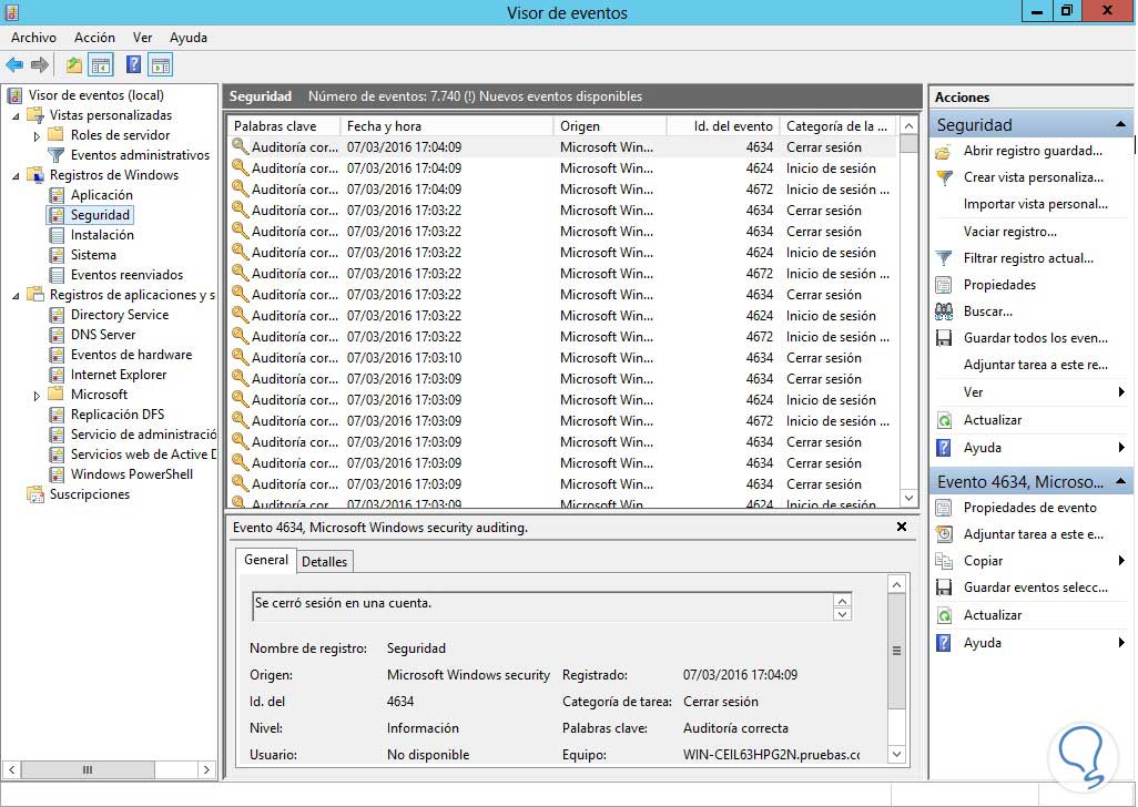 Cuando tenemos configuradas nuestras políticas de seguridad, en el visor de eventos podremos ver todos los diferentes sucesos que han ocurrido en nuestro servidor, estos eventos están representados mediante un código numérico, veamos algunos de los eventos más representativos: