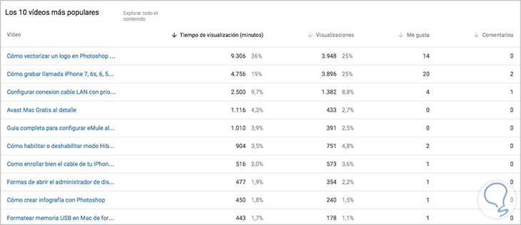 Luego se encuentran “Los 10 videos más populares” de tu canal, lo cual es muy útil para saber cuál de tus videos está generando mas interés entre los usuarios. Si publicas distintos tipos de contenido (tutoriales, hauls, noticias, tips, video blog, etc.), esto puede servir como indicador de cuáles tipos de video funcionan mejor para tu canal y tu audiencia.