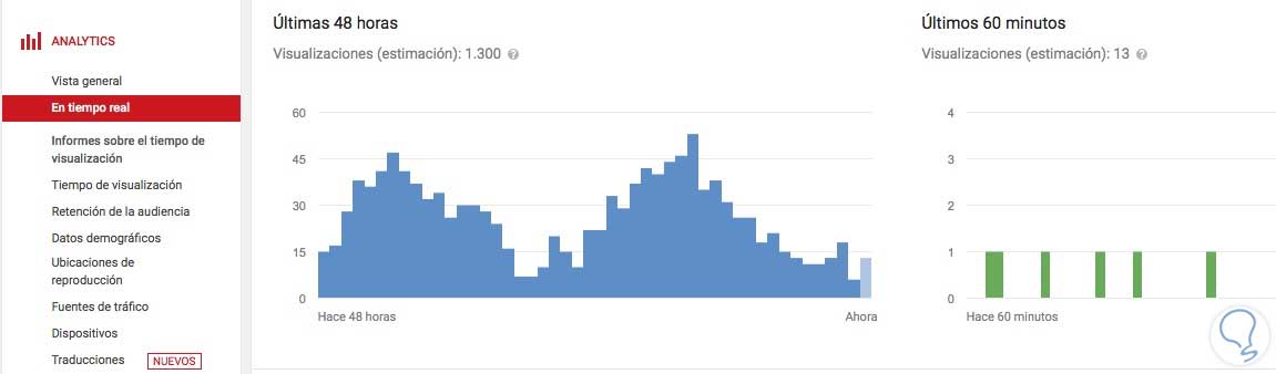 La siguiente sección a tu disposición es “En tiempo real”. Como su mismo nombre lo dice, allí puedes ver lo que sucede en tu canal minuto a minuto, ya que se actualiza de forma automática cada 10 segundos. Si no tienes actividad en el momento, abajo te mostrará los videos que sí han tenido actividad en las fechas/horas más recientes.