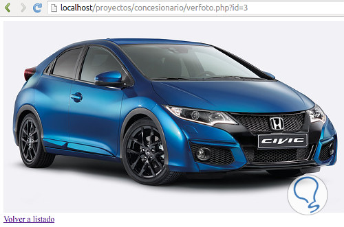 El formulario para dar de alta los datos que nos permita dar de alta una foto, para ello deberemos usar elementos file que nos permita seleccionar un archivo desde el navegador para y luego procesarlo con PHP y guardar los datos en los campos blob de nuestra tabla autos de la base de datos.