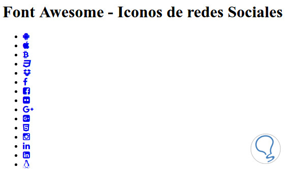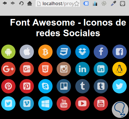 Cada icono está representado por una clase fa-icono así por ejemplo el icono para YouTube será fa-youtube, el resultado al mostrar en el navegador sera el siguiente: