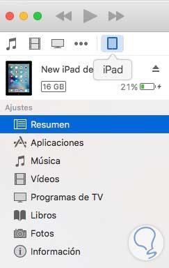 Una vez que iTunes está abierto, tenemos que situarnos en la parte superior izquierda de la ventana y buscar el icono de nuestro dispositivo previamente conectado. (Vamos a ver un iPhone o iPad en función de lo que hayamos conectado). Tenemos que hacer clic en el. En este momento iTunes cambiará la información sobre el dispositivo.