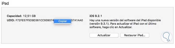 Ahora podemos copiar el UDID ya que es una gran cadena de caracteres. No podemos seleccionarlo, por lo que debemos pulsar en el botón derecho del número y seleccionar la opción de “Copiar”.