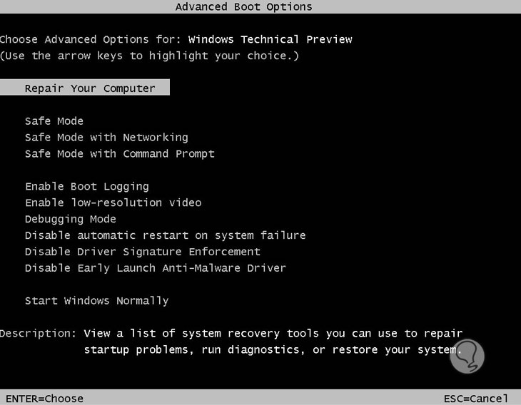 Ahora al arrancar el sistema, pulsando F8 podremos volver a ver el menú típico de versiones anteriores en Windows 10. Pudiendo entrar en: