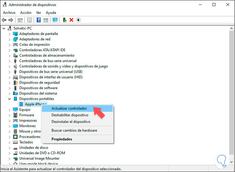 Ahora debes de hacer clic derecho sobre tu dispositivo de Apple y pulsar en “Actualizar controlador”.