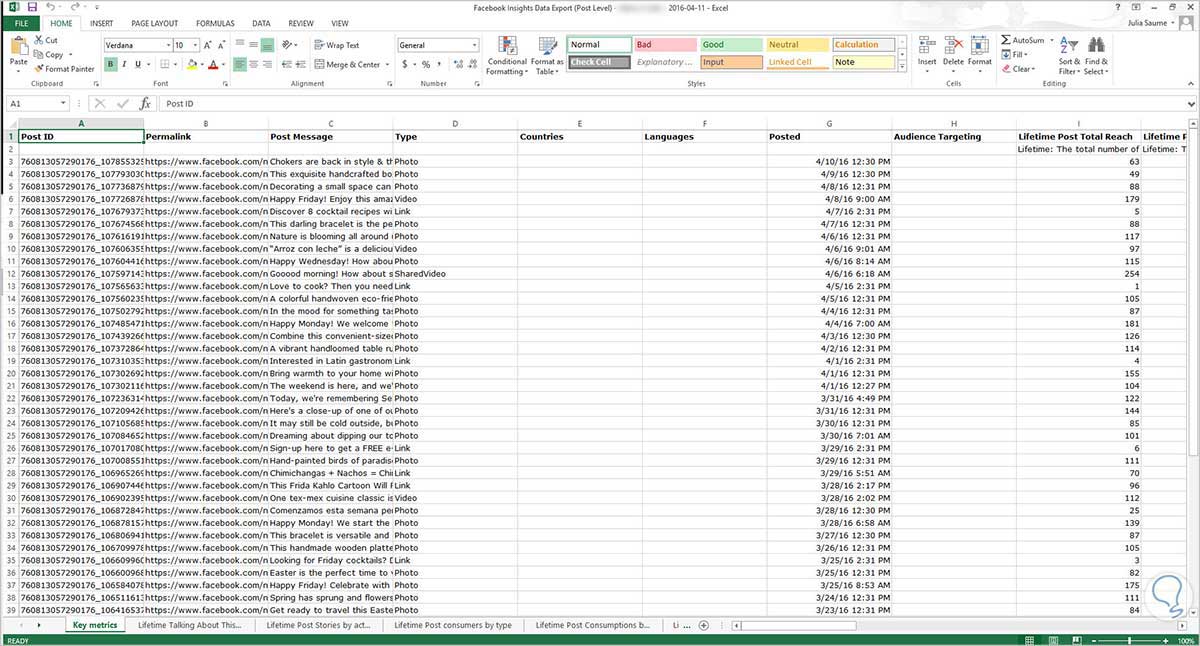Si durante ese período has activado alguna campaña paga y quiere solo ver tu alcance orgánico escoge la columna “Lifetime Post organic reach” y suma sus valores. Si en cambio quieres ver el alcance pagado usa los valores de la columna “Lifetime Post Paid Reach”. Este será el valor que colocarás en el denominador de la fracción en caso de que quieras calcular el engagement para análisis propio. Si deseas hacer análisis de competencia, usa como denominador el número de fans que tiene tu página de Facebook (734).