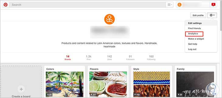Dirígete a tu perfil y busca la tuerca en la esquina superior derecha. Haz clic y en el menú desplegable escoge “Analytics”.