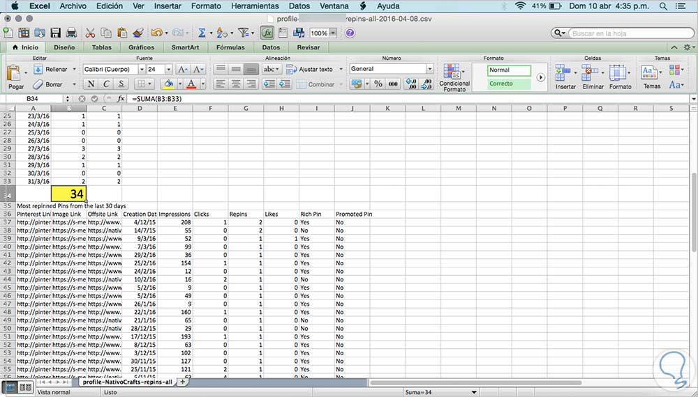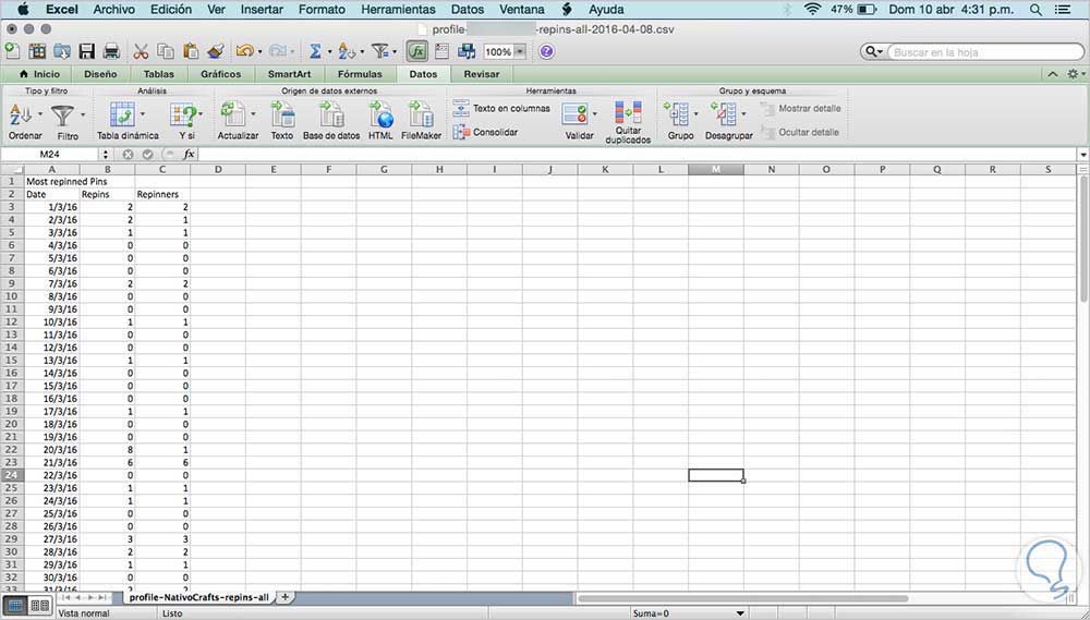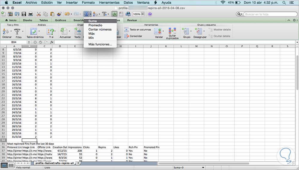 Esto sumará los valores de esa columna y te mostrará la cantidad de repins que has tenido en el rango de fechas que escogiste.