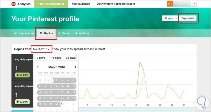 Selecciona la pestaña “Repins”, escoge el rango de fechas (yo seleccioné marzo), y haz clic en “Export data”