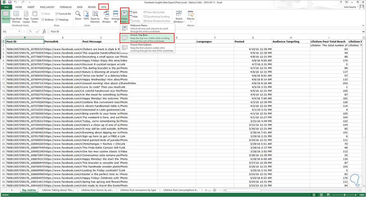 Y desplázate hasta la columna “Lifetime post total reach”. Suma los valores de esa columna para obtener el alcance total del período de tiempo que has seleccionado. La suma da 4.921: